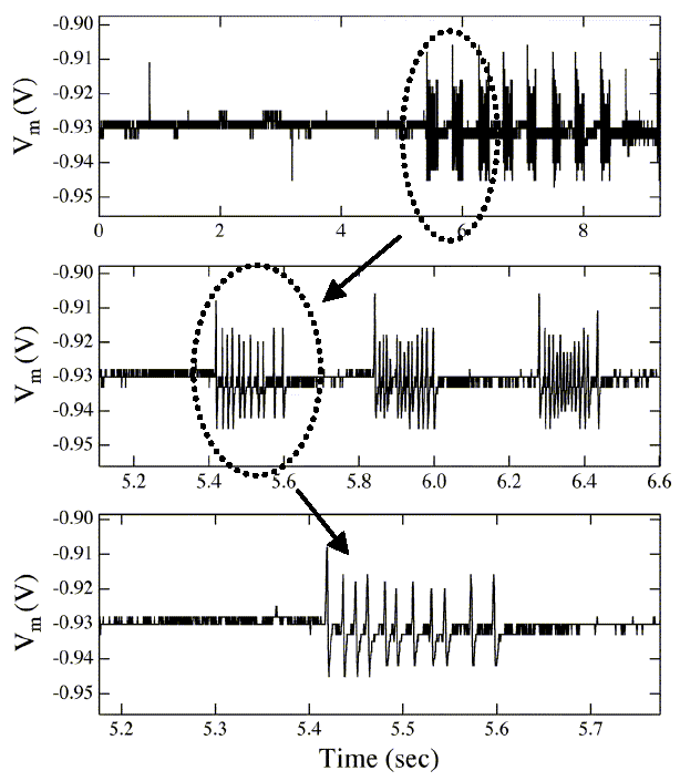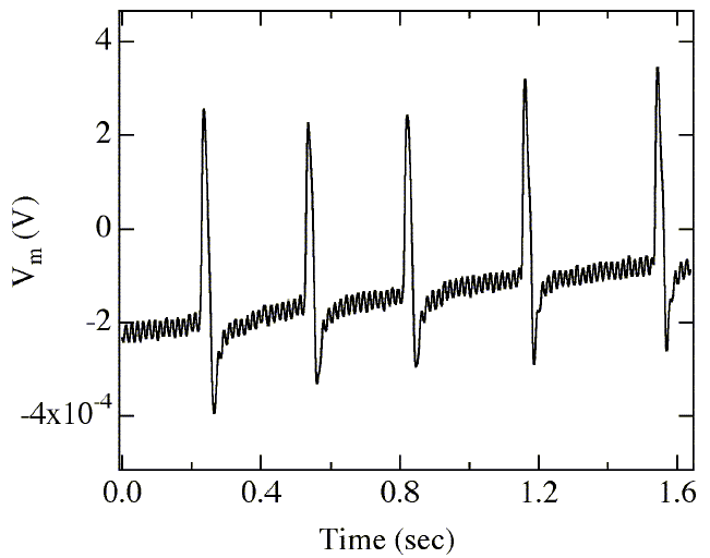 Figure 4: Evoked extracellular potentials in the lobula plate of Manduca sexta (hawk moth) plotted versus time. Figure 5: Spontaneous intracellular potentials in a neuron in the brain of Tritonia diomedea (a sea slug) plotted versus time. The positioning of the probe was controlled via micro-manipulators and an optical microscope.