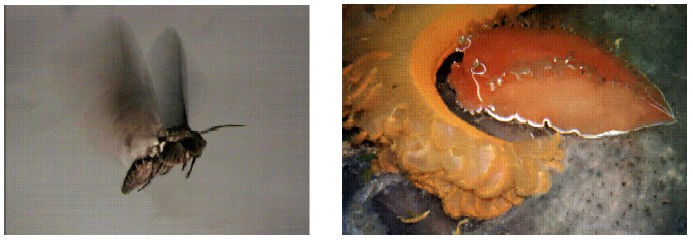 Figure 1: The biological models used in this work. (a) Manduca Sexta is typically 4cm in length, with a 12cm wingspan; at 2.5g, it is among the largest of insect flyers. It can easily carry a test-electronics payload. (b) Tritonia diomedea is typically 20cm in length, and has a readily accessible brain with large and well-characterized neurons.