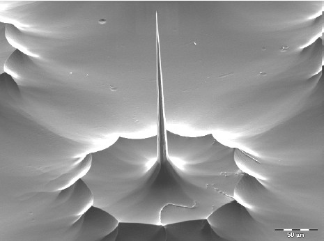 Figure 1: DRIE-etched pillars; pitch diameter 250 µm. The pillars are about 300 µm tall. The use of protection pillars ensures a straight profile.. Figure 2: RIE-sharpened silicon needle. The needle is 230 µm tall and etched from the needle pillar shown in Figure 1. The protecting pillars are eliminated during the sharpening process.