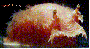 Figure 2: Tritonia is a marine nudibranch foundworldwide with an unusually large species, Tritonia diomedea, indigenous to the Pacific Northwest. Its neuronal cell bodies range from roughly 5µm (the same size as vertebrate neural cells) to specialized cells that are approximately 100 times as large. With our existing experimental platform for this animal we can begin experimenting on the large neurons and then gradually scale to cells of smaller size. (© J. A. Murray) Figure 3: Cartoon view of the implantable recording system (not to scale). The microprobe and signal amplifier (total size: 2 x 2 x 1 mm3) are attached to the brain tissue of T. diomedea (the animal is about 20cm in length). A thin tether cable connects to a recording unit in the visceral cavity. The microrecorder comprises a semicustom microcontroller, memory, and battery.