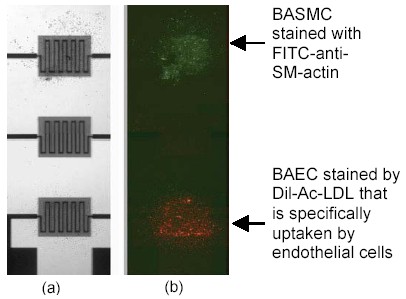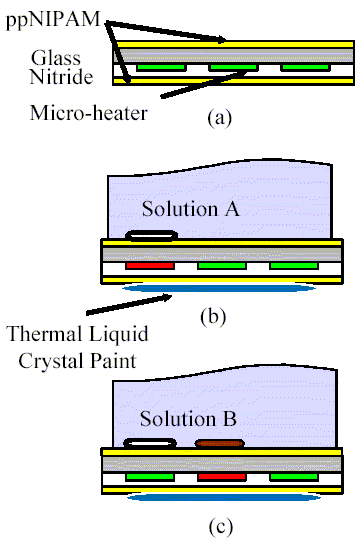 Programmable surface chemistry has been achieved by depositing a temperature sensitive polymer onto arrays of micro-fabricated metallic heaters. Activating a single heater causes a localized change in the device surface chemistry from non-fouling to fouling in an aqueous environment. Two types of proteins and two types of cells were used to demonstrate localized immobilization of proteins and cells on such surfaces. These experiments show, for the first time, selective cell attachments on thermally responsive polymer controlled by a micro heater array. It suggests a new approach to realize proteomic chips and cell chips.Selected Publications